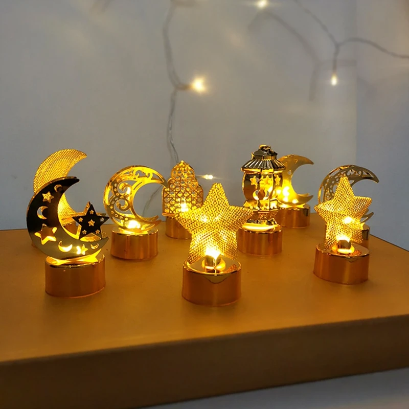 This LED Eid Decorative Candle Light is crafted from high-quality golden iron and features elegant star and moon cut-out patterns that cast a warm, inviting glow. Designed to deliver the ambiance of candlelight without flame risk, it uses soft warm-white LED lighting to create a cozy and festive atmosphere.
